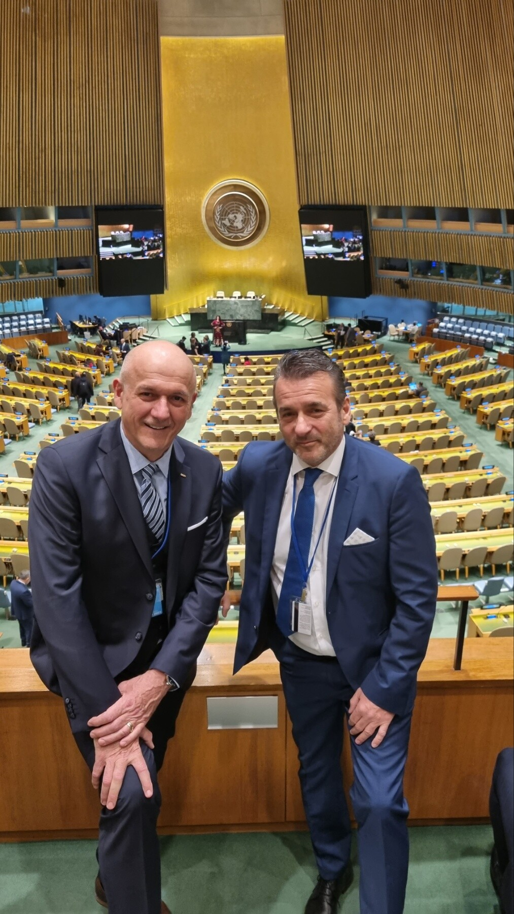 Dr. Kovács Károly és Forintos Róbert, HWP elnök és társelnök az ENSZ 2023 Vízügyi Konferencia közgyűlés termében