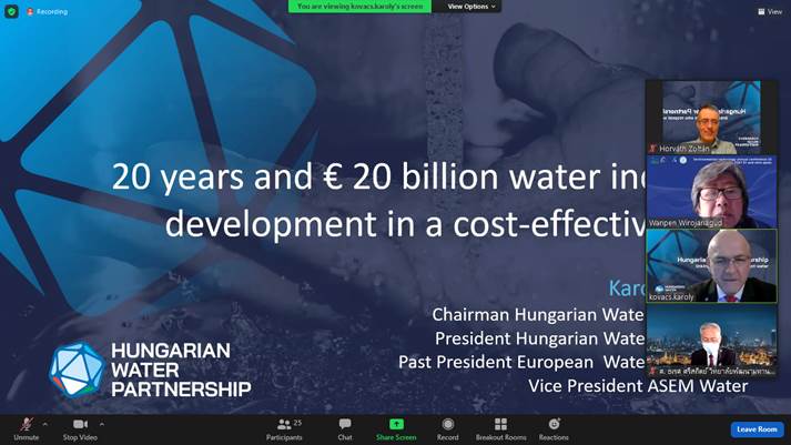 Kovács Károly 2021. november 23-án előadást tartott az Environmental Engineering Association of Thailand (EEAT) által szervezett, éves szakmai konferencia hulladéklerakók témájú, japán hátterű (APLAS) nemzetközi webináriumán. Prezentációjában a HWP elnöke tájékoztatást adott a HWP tevékenységéről és a tagvállalatai által a szennyvíz- és vízgazdálkodás terén kínált megoldásokról, különös tekintettel a csurgalékvízkezelésre. Az előadás nagy figyelmet kapott, több szakmai kérdés hangzott el és jó hangulatú beszélgetéssel ért véget. Az eseményt követően a thaiföldi partnerszervezet elnöke jelezte, hogy nyitott a további együttműködésre és meghívta a HWP-t a jövő évi, nemzetközi rendezvényeikre.