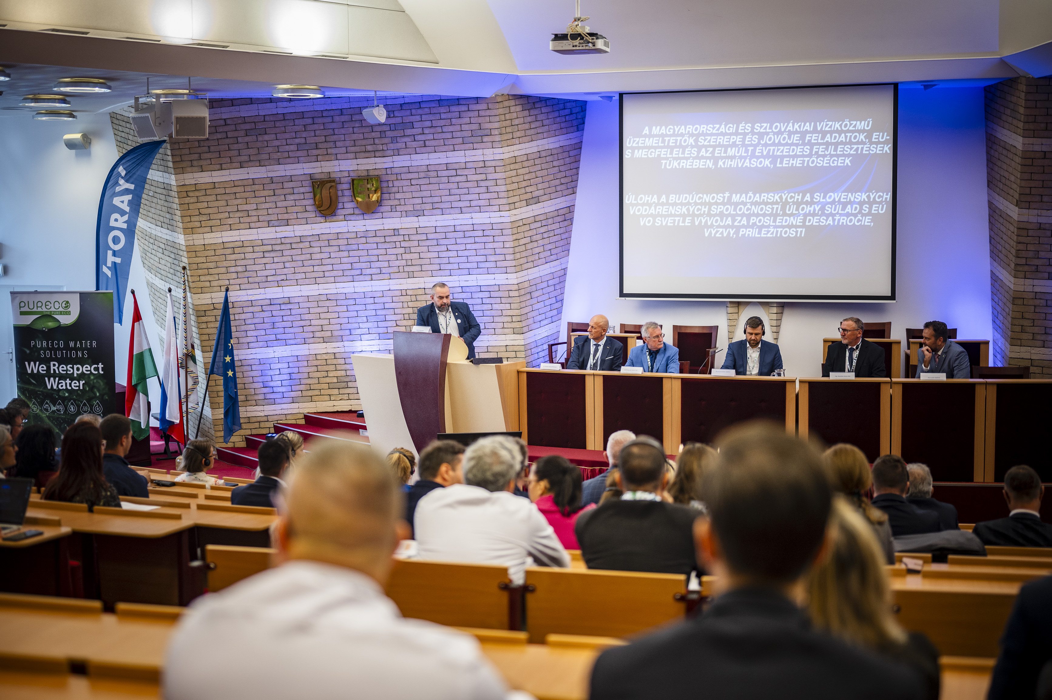 A Selye János Egyetem konferenciaközpontja adott otthont szeptember 19-én a Magyar-Szlovák Vízipari Szakmai és Üzleti Találkozónak. A konferencia védnöke Dr. Balogh Csaba, hazánk pozsonyi nagykövete volt. A rendezvény első részében a két ország vízügyi, vízipari helyzetéről hangzottak el előadások. Ezt panelbeszélgetés követte a víziközmű üzemeltetők szerepéről, jövőjükről, feladatairól. A konferencia kiemelt témája a pénzügyi döntéseket megalapozó környezeti, szociális és irányítási szempontrendszer (ESG) volt. Három kérdéskör alapján vizsgálták meg ennek a fenntarthatósági követelményrendszernek a hatását a vízipari és vízügyi ágazatokra: az ESG hatása a vállalatok napi működésére, az ESG-szempontú vízipari műszaki megoldások, valamint az ESG-vonatkozású hazai és szlovákiai vízipari esettanulmányok.