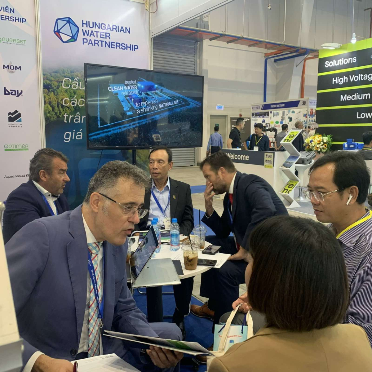 Több fontos vietnámi vendéget fogadtunk a standunkon. Ezek közé tartozott a VWSA elnöke, Dr Nguyen Ngoc Diep, akivel a szervezeteink között több éve fennálló együttműködés konkretizálása érdekében aláírtuk a HWP-VWSA-HWA (a 3. fél a HWP partnerszervezete, a Magyar Víz- és Szennyvíztechnikai Szövetség) háromoldalú munkatervet. A dokumentum a 2023-2025 közötti időszakban biztosít keretet a tervezett közös feladatokhoz. Megbeszélést folytattunk továbbá Tran Quoc Hung-al, a Hanoi Water Limited Company (Hawacom) vezérigazgatójával is.